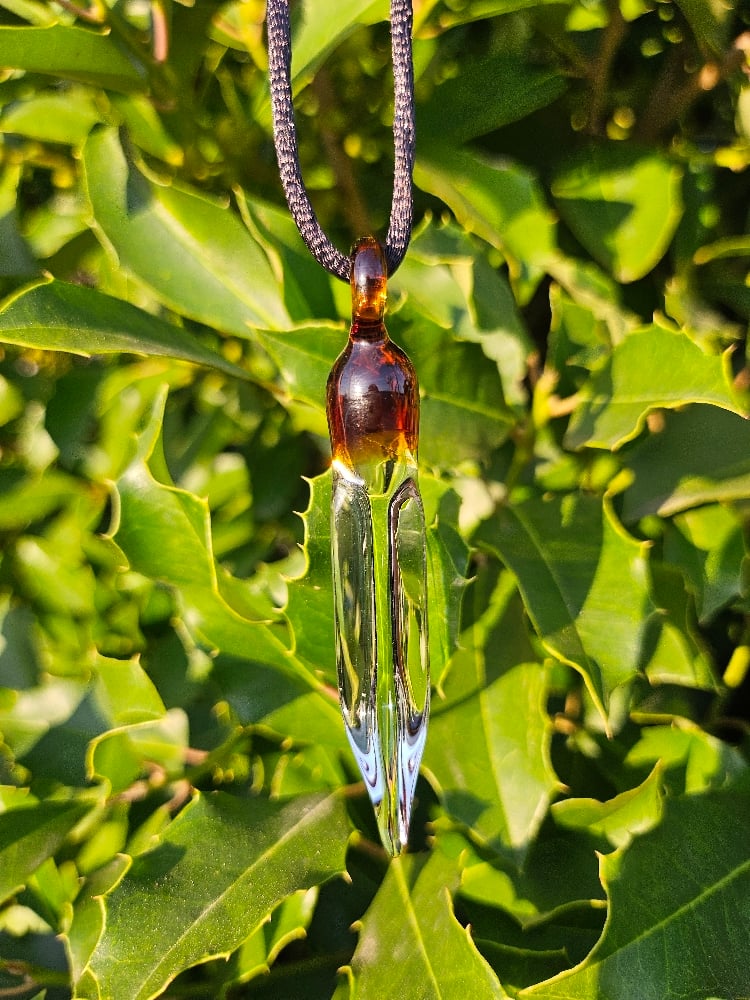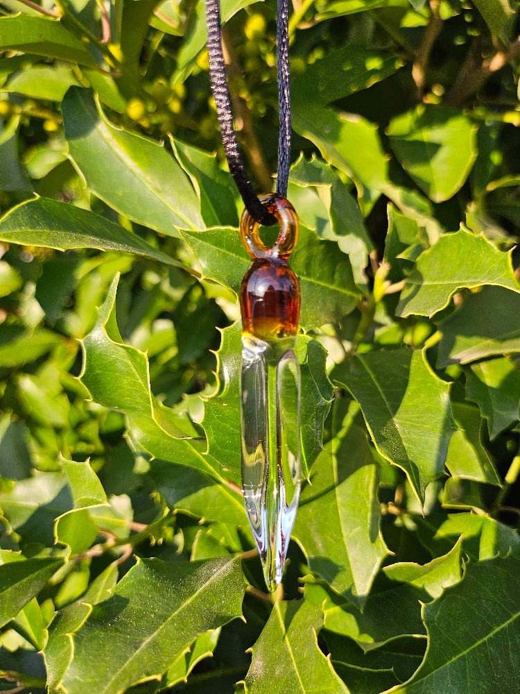 Three sided crystal pendant with amber accents. Gives off wonderful light prisms in the sun.