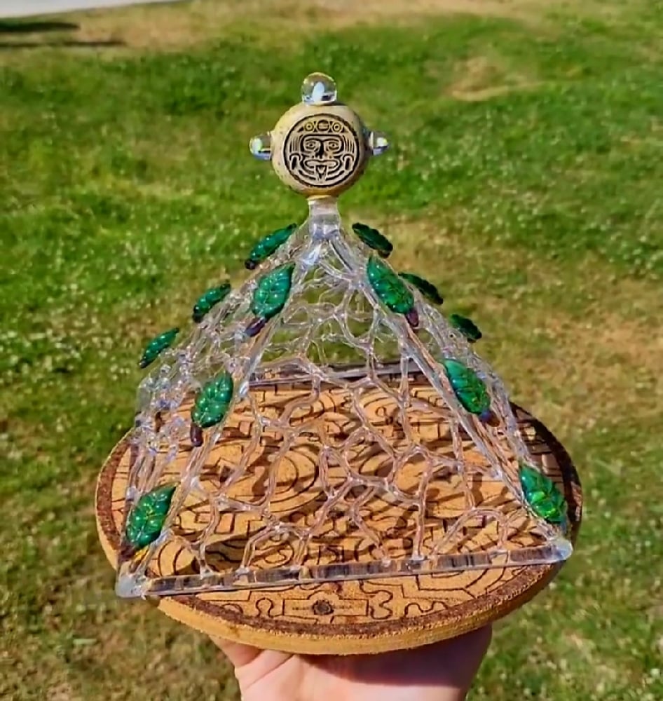 This is a fully networked pyramid. It consists of a carved Aztec sun with 3 white opals and several plantphibian leaves.