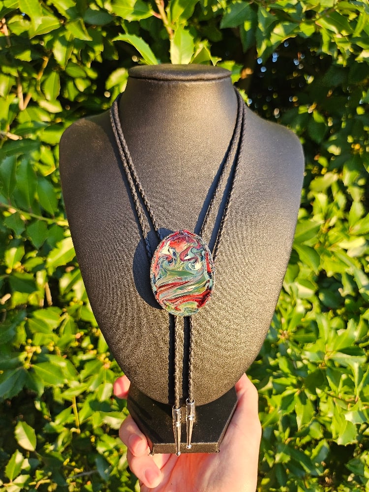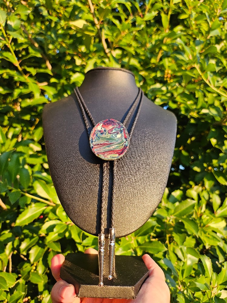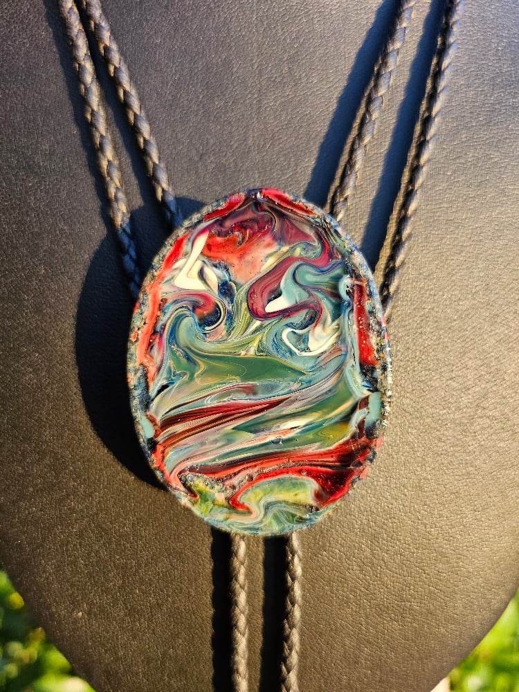 This bolo tie is made of a glass Geode slice. Lots of fun colors run through it as well as a stone like color and feel to the back side.