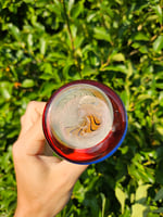 This Grateful Dead themed bubbler is a collaboration with Phase Glass. It's consists of his silver & gold fumed sections, pomegranate & cobalt leaves, white, & millie chips.