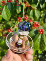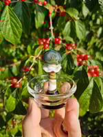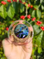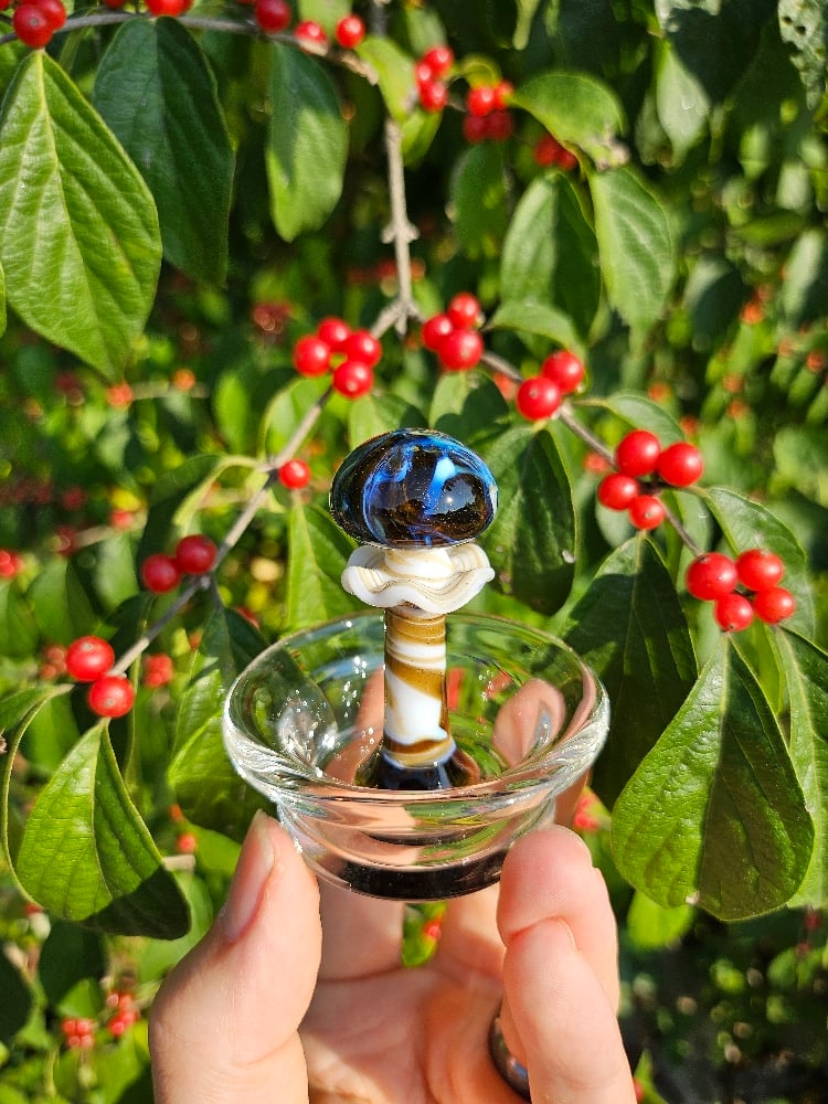 Small clear dish with a fully worked mushroom in the center. Multiple colors give the mushroom sparkly whispy swirls.